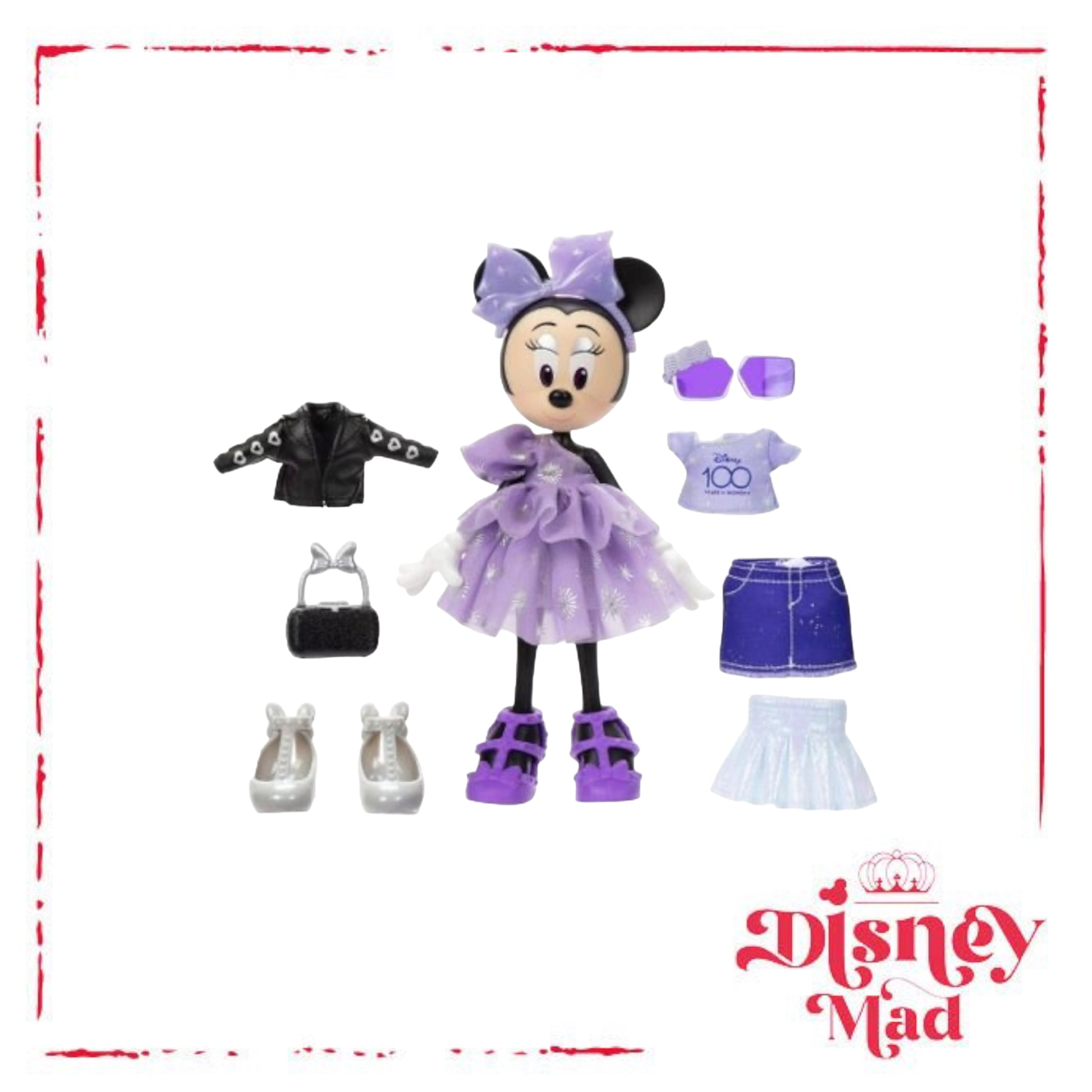 Accessories include faux leather jacket, ''denim'' skirt, pleated skirt, t-shirt with ''Disney100'' logo, purse, sunglasses and extra pair of shoes.