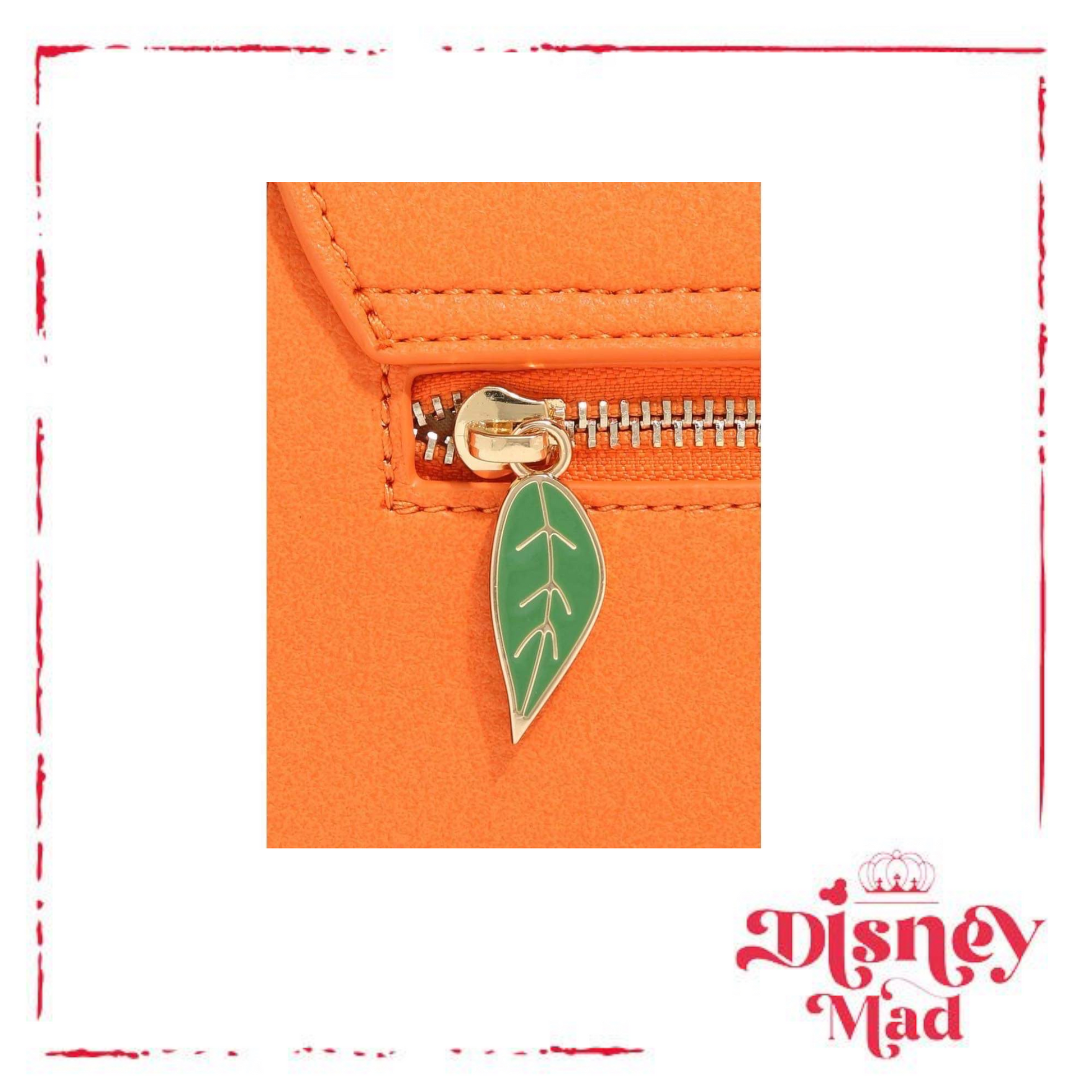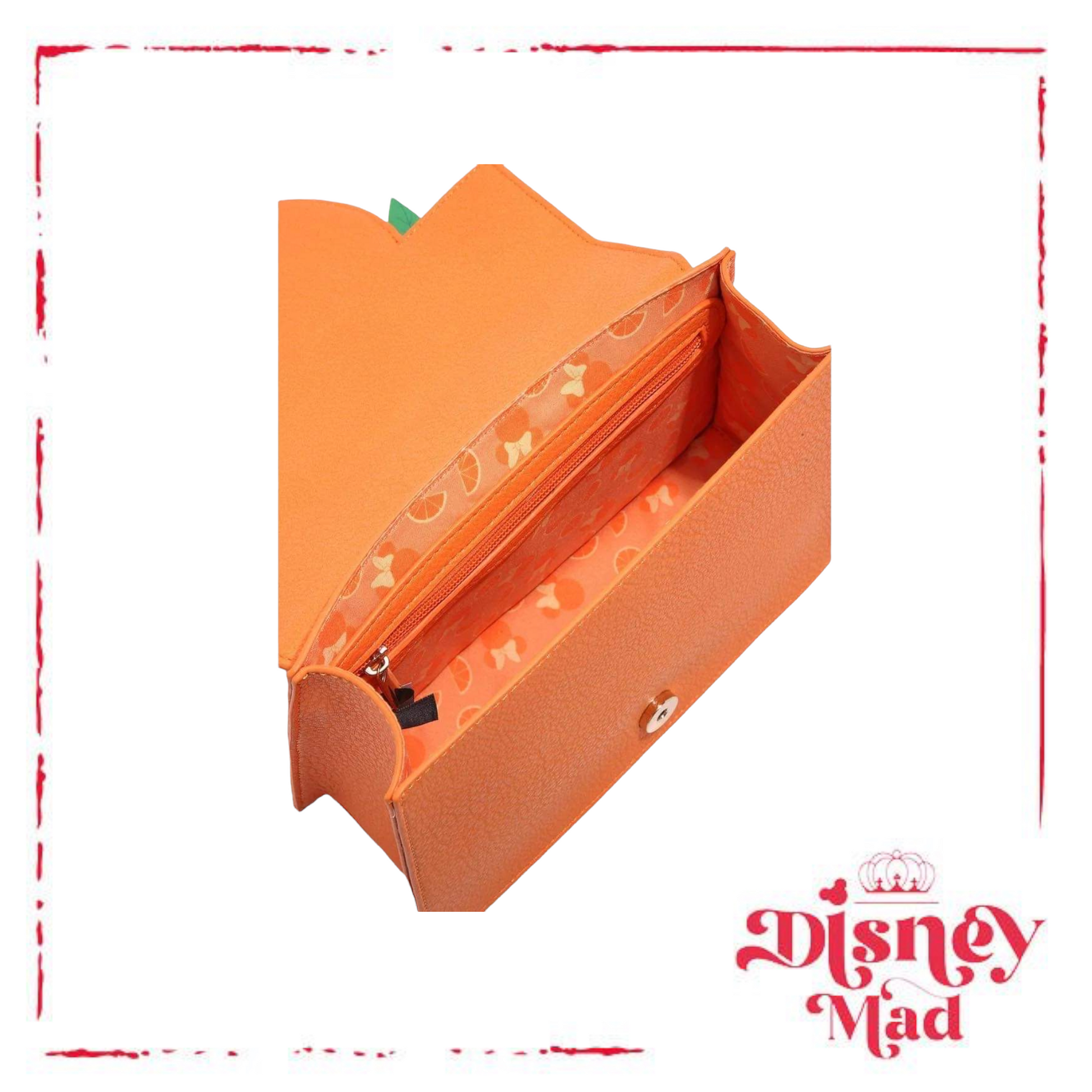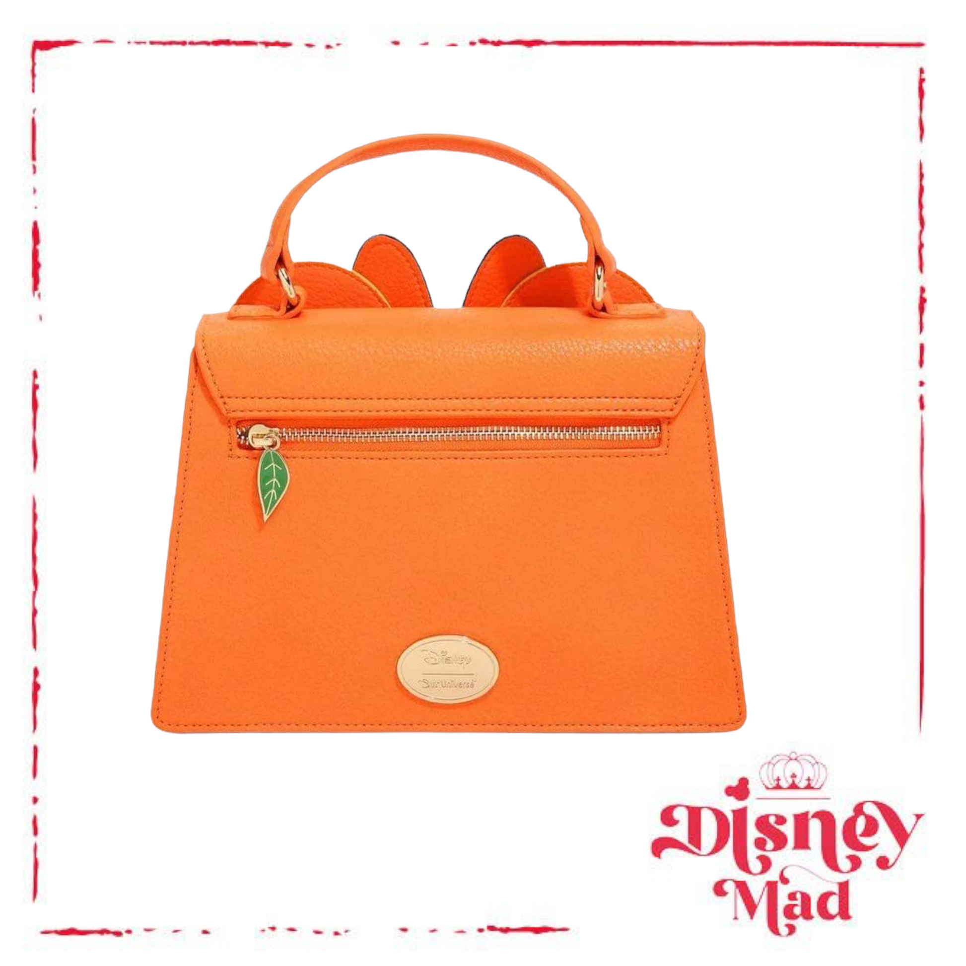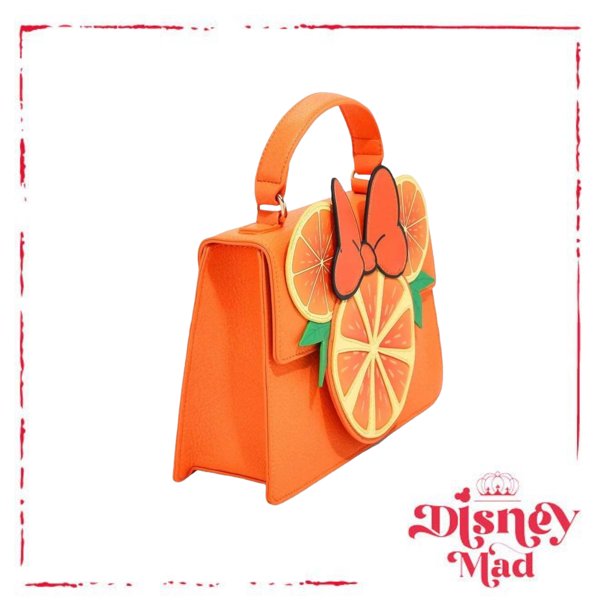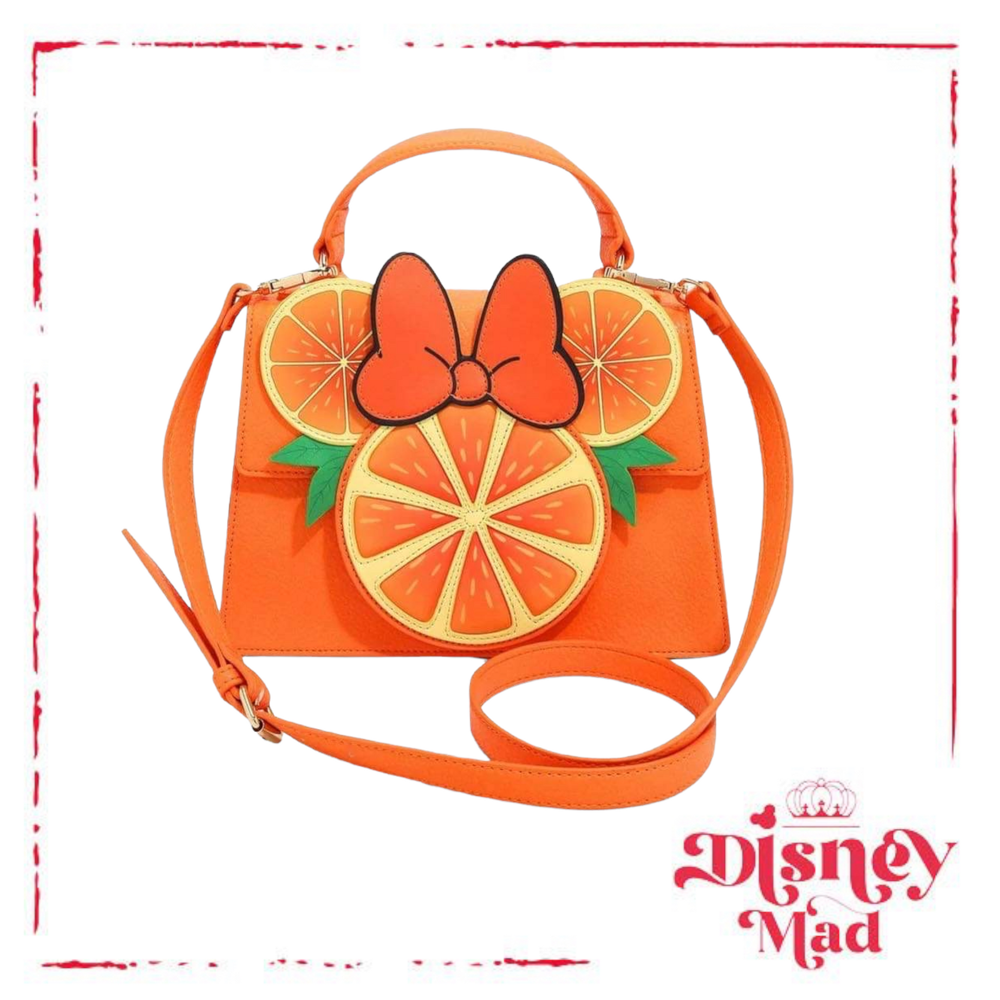 Minnie Mouse is bringing a sweet and fruity treat to your wardrobe with this crossbody bag from Our Universe! Featuring a die-cut appliqué of Minnie's Mouse Ears logo reimagined with a citrus twist, the bag's matching solid-color canvas makes a perfect accenting style for a slight dash of orange to any look. Also includes an enamel brand badge on the back, gold-toned hardware, a removable adjustable shoulder strap, and an orange leaf enamel zipper pull.