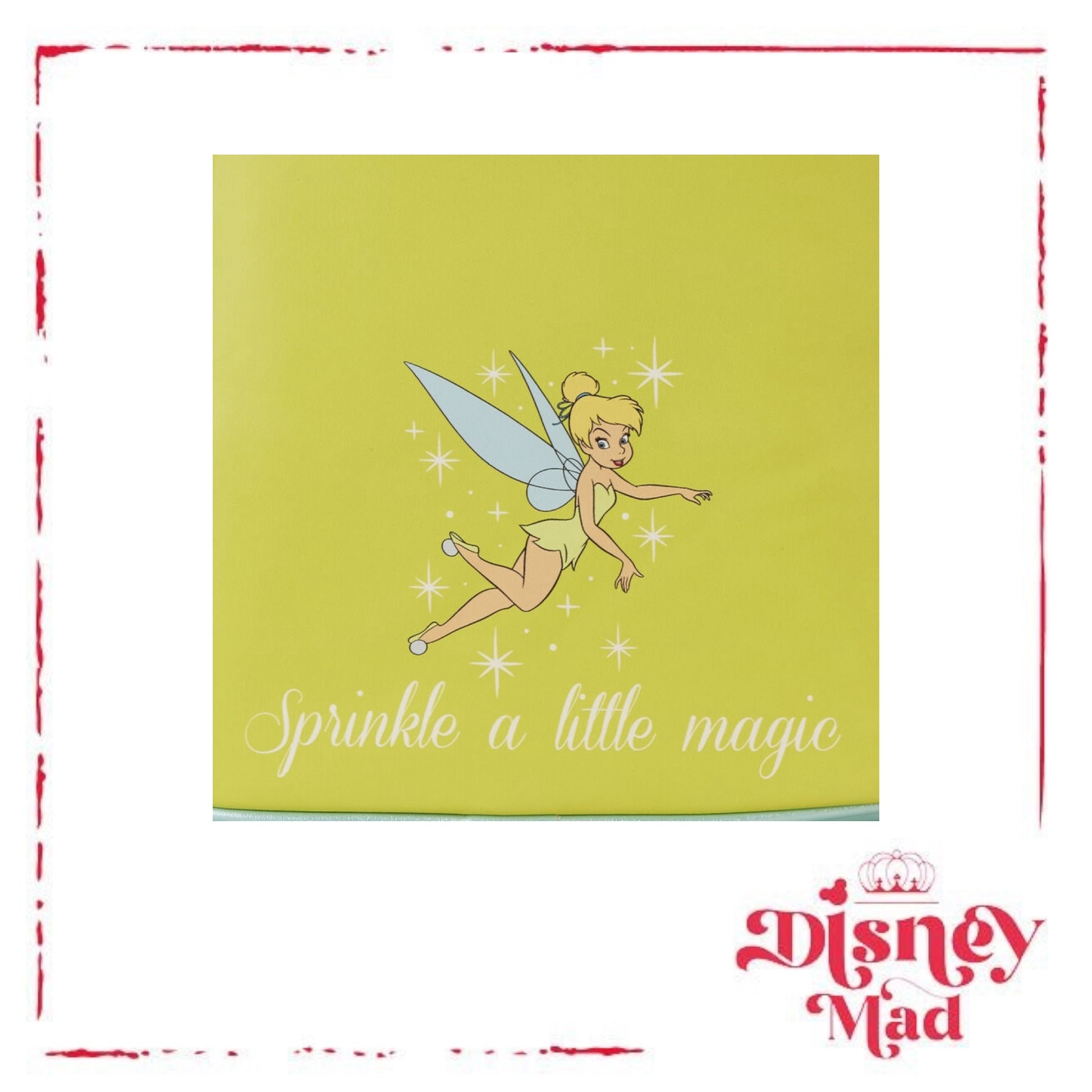 Follow the pixie dust™ toward adventure with our exclusive Loungefly Disney Peter Pan Sequin Tinker Bell Mini Backpack. This accessory is full of sparkle! On the front, you’ll find light and airy wings belonging to Disney’s Tinker Bell. They rise up over the top of the backpack and are a clear, glittery PVC material. Blue embroidery adds a decorative flair and wispy textures create a butterfly wing effect. Tinker Bell’s face also rises up over the top pocket; her facial features are embroidered, and her hair sparkles with gold sequins. The front pocket includes a die-cut shape of her fringed skirt, which also sparkles in green sequins. Green sequins cover the top of the backpack as well, and a gold-colored metal charm of a spark of pixie dust tops off the look. Iridescent blue straps add more shimmer. On the back, Tinker Bell makes an encore appearance, along with the words, “Sprinkle a little magic.” Show off your sparkle wherever you go with this brilliant accessory.