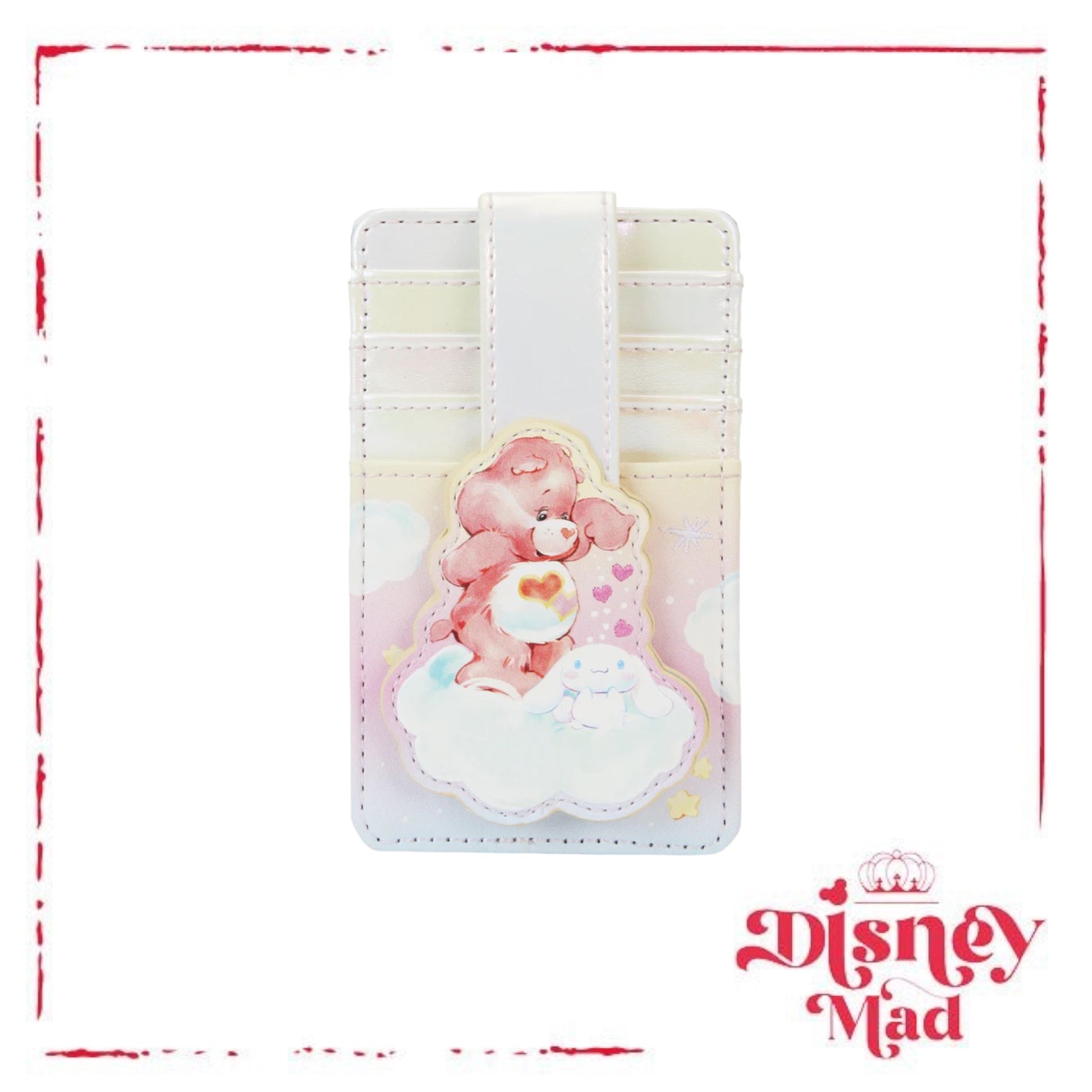 The exclusive Loungefly Hello Kitty and Friends x Care Bear Care-a-Lot Card Holder is made of vegan leather (polyurethane). Additional features include applique, debossed, embroidered, and printed details.