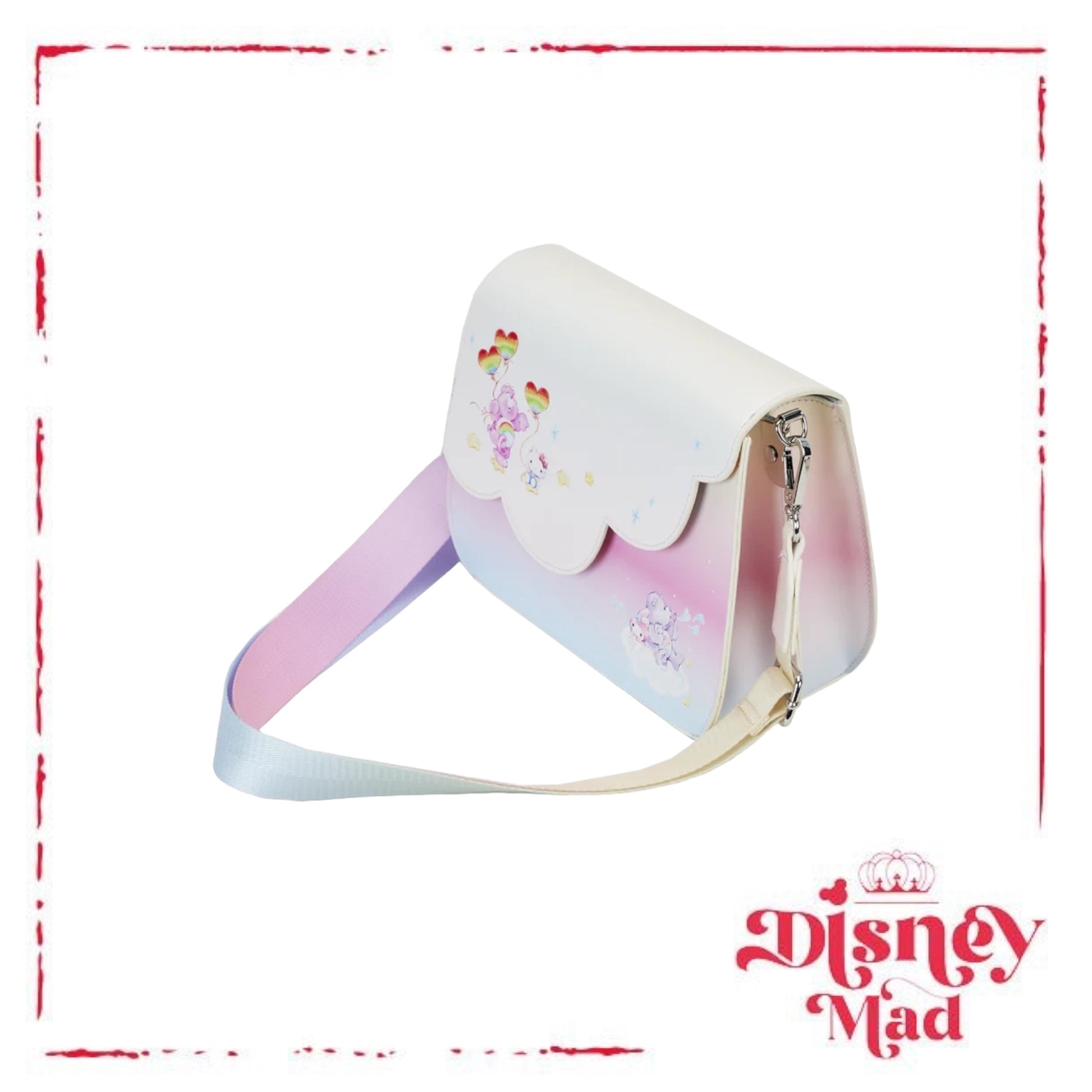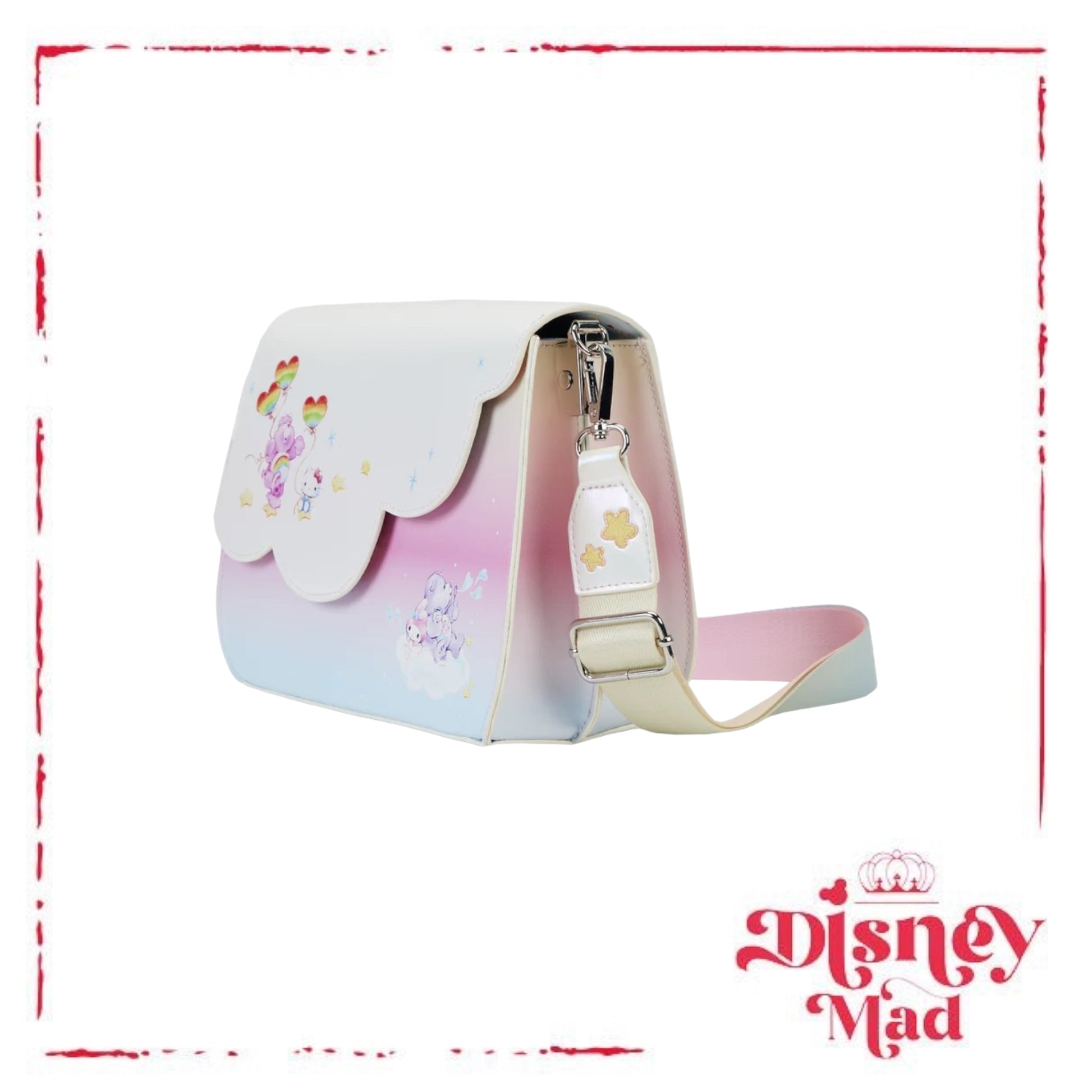 The Loungefly Hello Kitty and Friends x Care Bear Care-a-Lot Crossbody Bag is made of vegan leather (polyurethane). Bag has adjustable shoulder straps (removable), vegan leather, sturdy silver-colored metal hardware, and printed, applique, embroidered, and iridescent details. Notice the coordinating inside lining. This bag is an officially licensed product. Bag dimensions (crossbody): 9.5” W X 6.5” H X 2.25” D