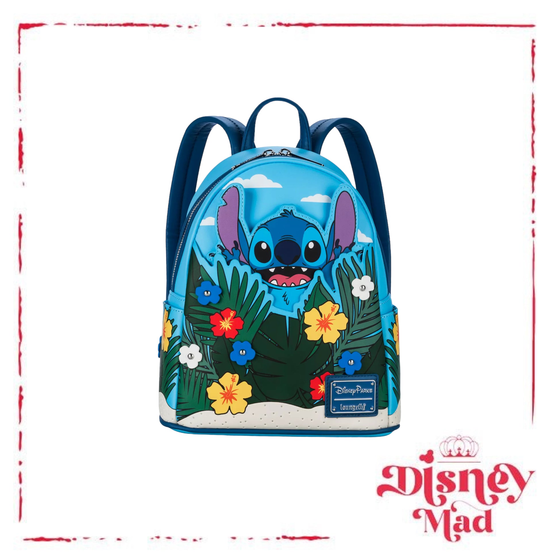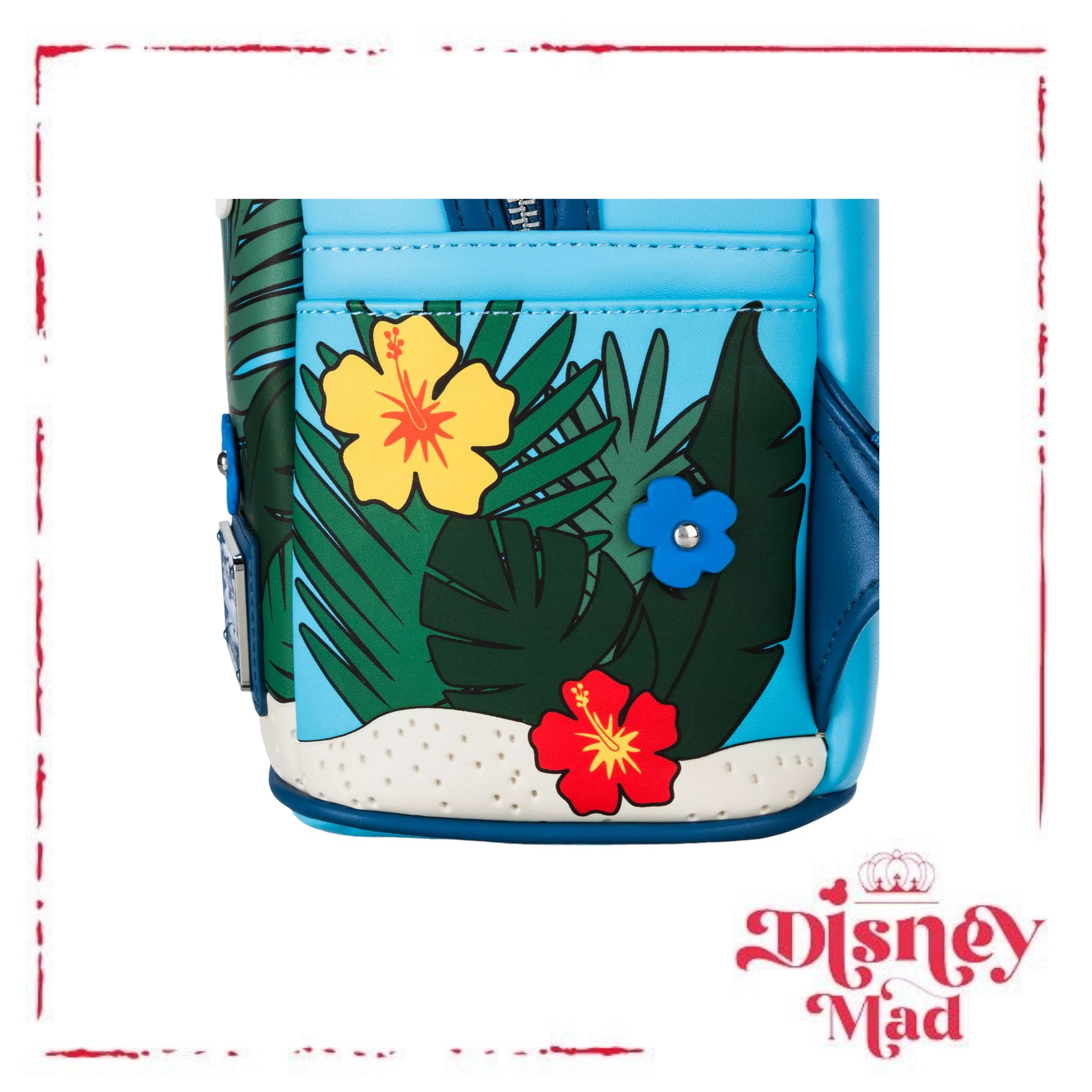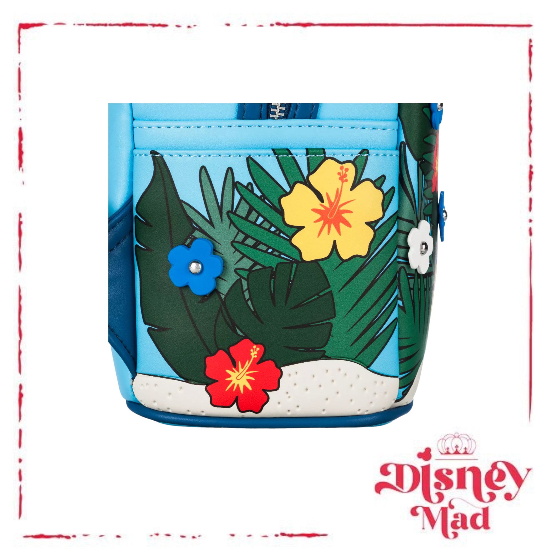 Take Stitch with your on all your adventures this summer with this stylish mini backpack by Loungefly. This simulated leather backpack features a 3D Stitch design with palm leaves and floral appliqués.