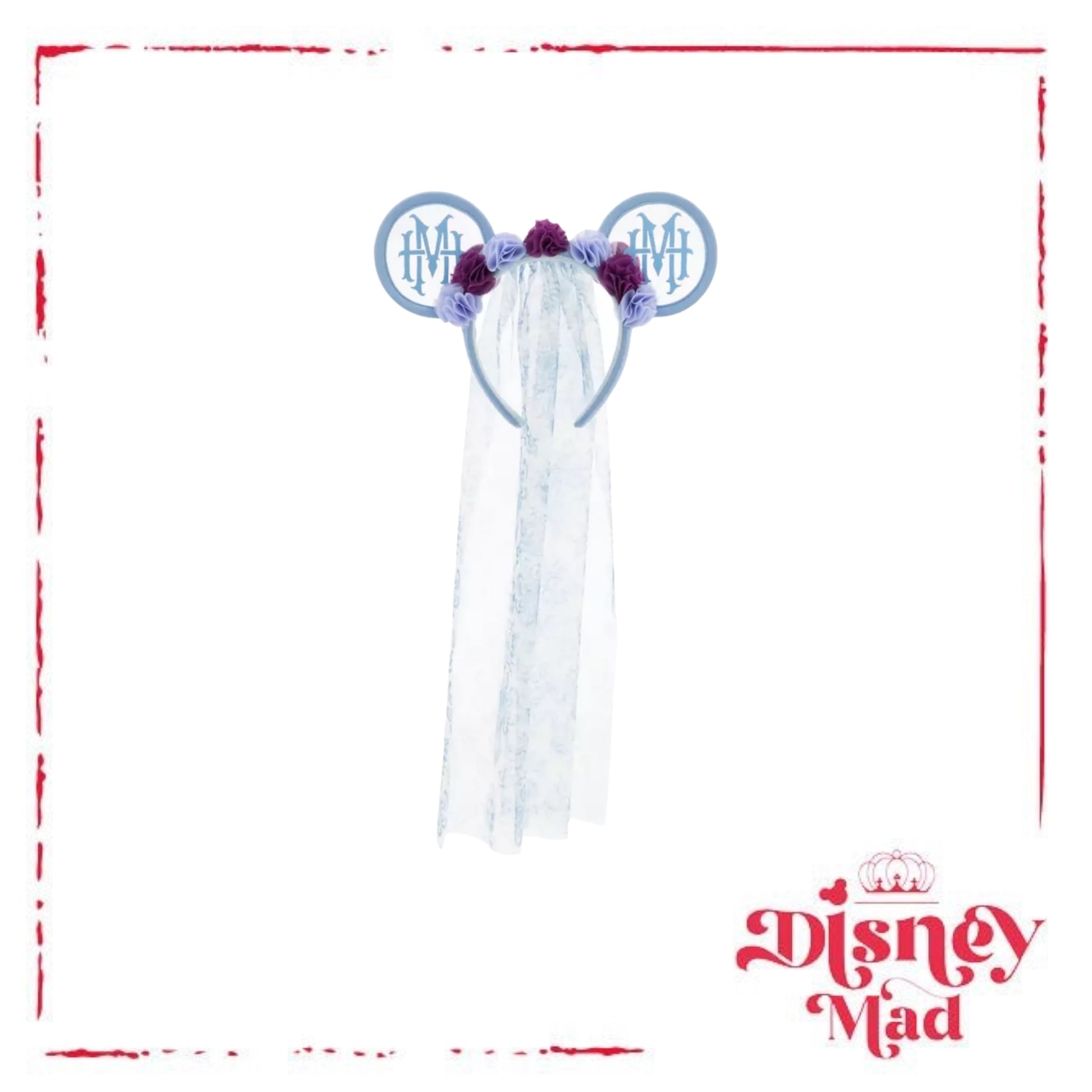 Here comes the most haunting accessory you'll find this side of New Orleans Square. This Haunted Mansion Bride veil is inspired by the one worn by Constance Hatchaway, the ghost bride who walks the halls of the Disney Park attraction. Topped with a floral wreath and mouse ears featuring the ''HM'' initials, this eerily lovely veil has a double layer of tulle decorated with the distinctive wallpaper design.