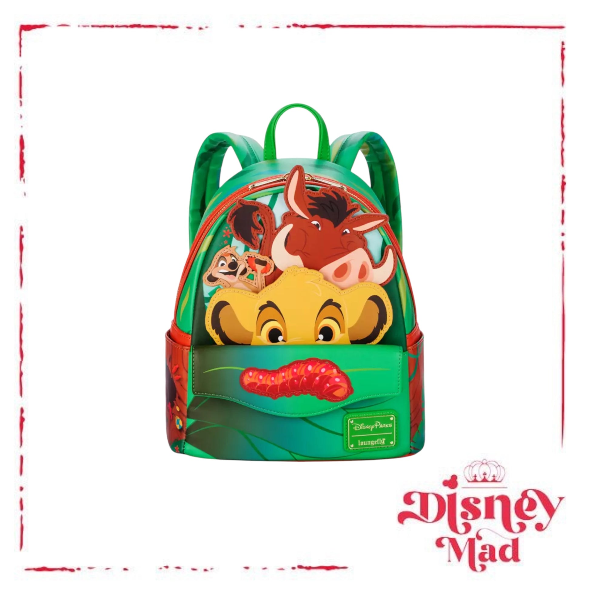 You'll have no worries fitting your everyday essentials in this fun and colorful mini backpack inspired by Disney's animated The Lion King. Created by Loungefly, the simulated leather bag features die-cut Simba, Pumbaa and Timon figures. Simba can even be moved up and down as he slides behind the front pocket which features a delicious shiny grub on the flap front. Yum!