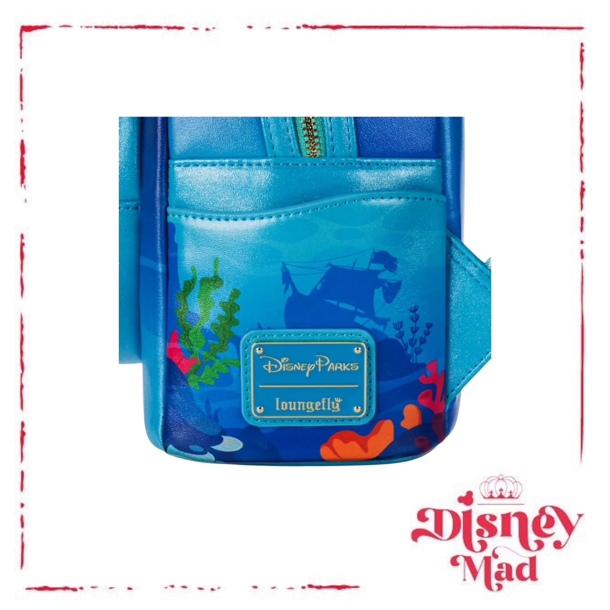 - Round exterior front zip pocket features Ariel and Flounder and clear PVC panel