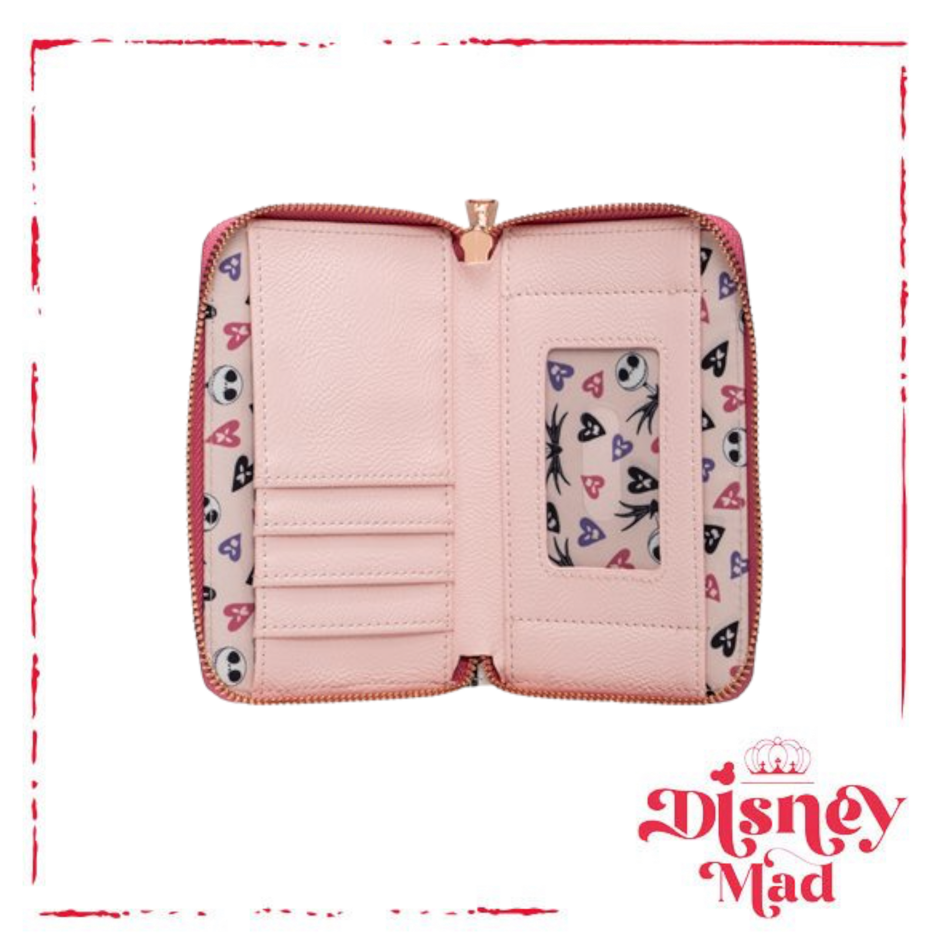 Entertainment Earth Exclusive! Your love might not have been born in Halloween Town, but it's certainly worth celebrating with this extraordinary The Nightmare Before Christmas Jack Skellington Valo-ween Wallet - Entertainment Earth Exclusive! Spotlighting Jack Skellington's face on the front and Valo-ween hearts on the back, it's made of faux leather and measures about 6-inches wide x 4-inches tall. Features include top zipper closure, matching themed lining, an ID window and card slots inside, shiny rose-gold hardware, and printed details. This makes a terrific gift for Valentine's Day or any Disney day, and you can only get it here at Entertainment Earth.