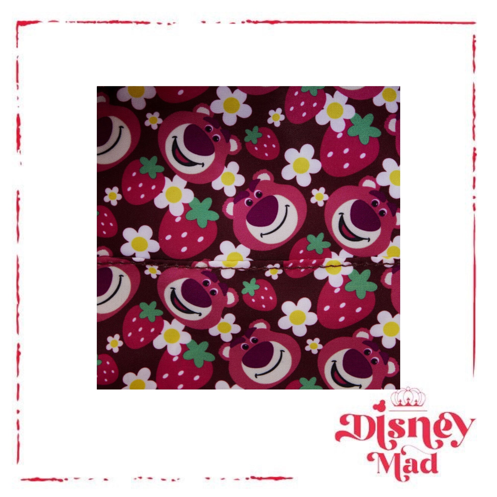 There’s nothing better than a bear hug! This soft and cuddly teddy is ready to accompany all your adventures as the exclusive Loungefly Toy Story Lotso Plush Pocket Mini Backpack. Taking shape on the bag’s top zipper pocket, Lotso Huggin’ Bear comes to life with fuzzy plush details and a yummy strawberry scent that accompanies his velvety nose. Look closely and you’ll see his moveable eyebrows take a menacing turn. Down below, Lotso’s arms snap into place on the front zipper pocket. Turn the bag around to see the phrase “Welcome to Sunnyside” decorated with flowers and strawberries. Perfect for playtime, this adorable accessory will stay by your side through thick and thin. Act fast to collect this exclusive Loungefly accessory; supplies are limited.
