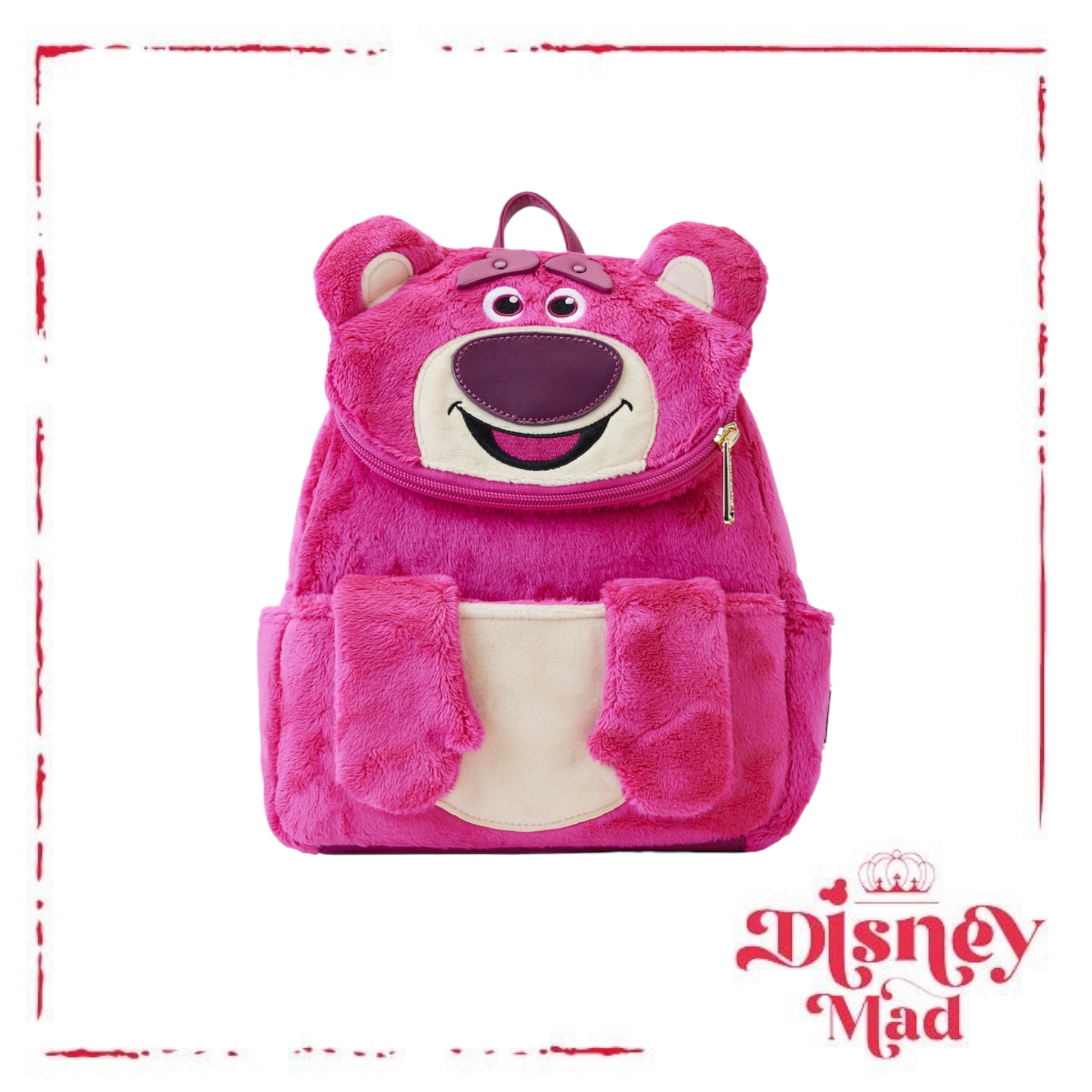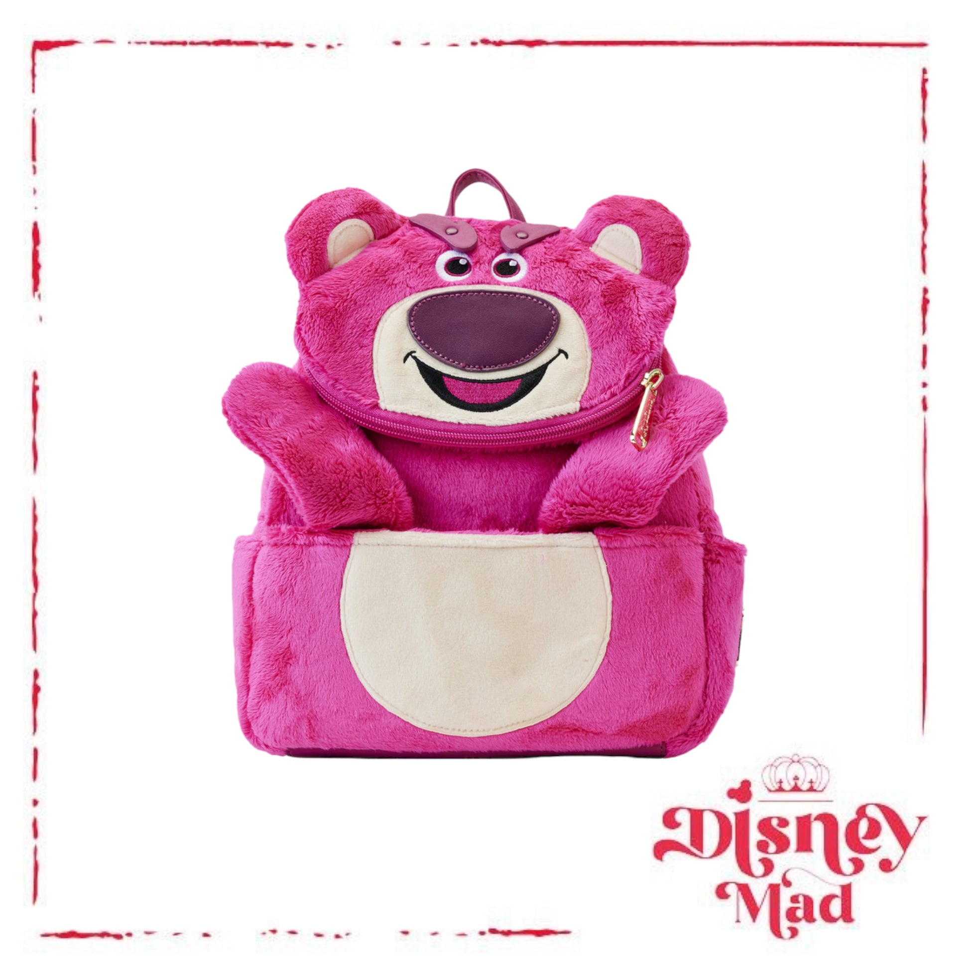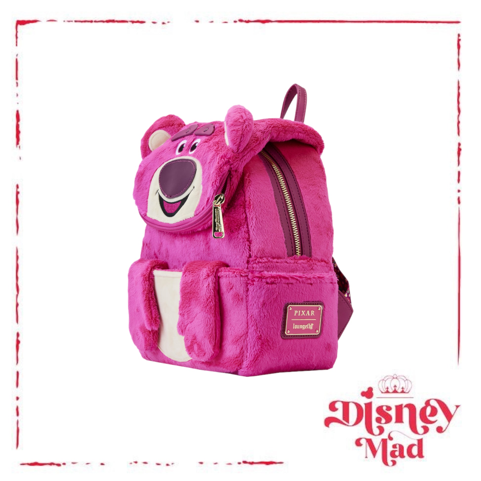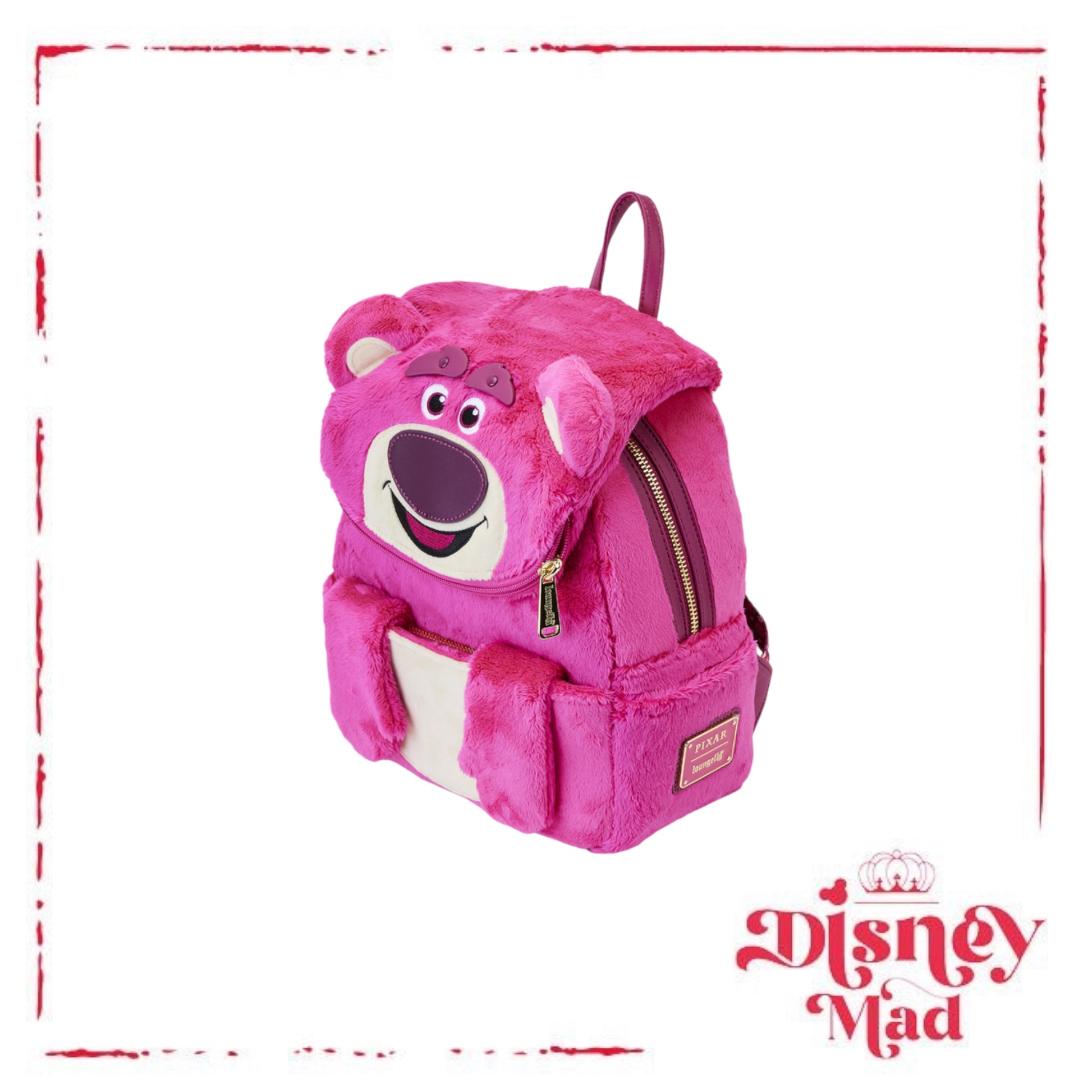 The exclusive Loungefly Toy Story Lotso Plush Pocket Mini Backpack is made of plush with vegan leather (polyurethane) trim. Bag has adjustable shoulder straps and shiny gold hardware. Additional features include applique, embroidered, scented, and printed details. Take note of the coordinating inside lining.
