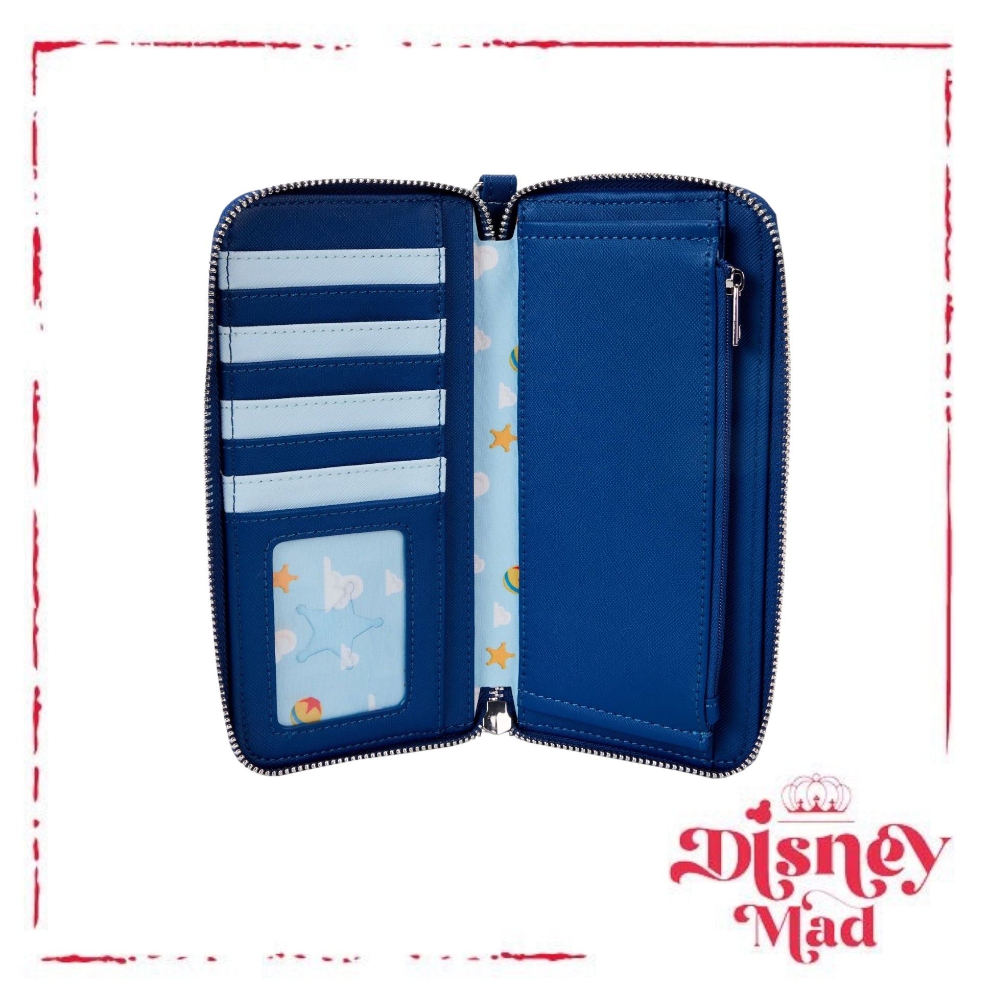 The Loungefly Toy Story Villains Zip Around Wristlet Wallet is made of vegan Saffiano leather (polyurethane). Wallet has shiny silver hardware and includes a detachable wrist strap, seven slots for holding cards, and a clear slot for ID. Additional features include debossed, embroidered, and printed details. Take note of the star-shaped die-cut ID window and the coordinating inside lining.